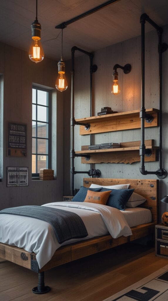 For older boys who prefer a modern, edgy look, an industrial-style room is a perfect fit. Think exposed wood, metal accents, and vintage lighting. A wooden bed frame with iron pipes gives a raw, urban feel. Edison bulbs add warm lighting without feeling too bright. Instead of traditional shelves, metal brackets with reclaimed wood planks add personality. This style is great for teens who want something cool, mature, and timeless without constant redecorating.