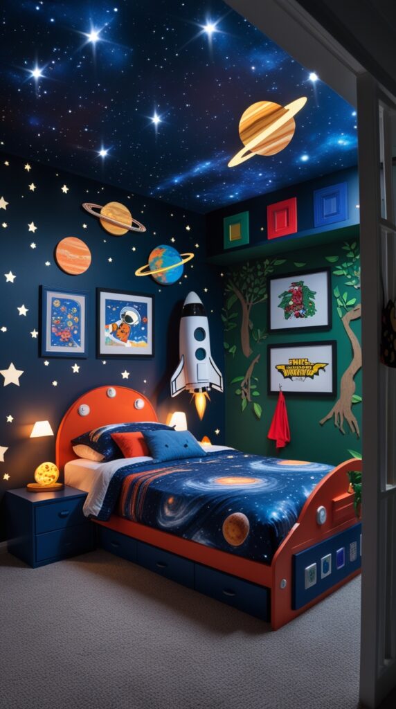 Every kid dreams of an exciting world of their own—why not bring it to life? A space-themed room with glow-in-the-dark stars and rocket-shaped beds can make bedtime feel like a mission to Mars. Love the outdoors? A jungle room with leafy wall decals and a treehouse loft bed adds a playful touch. For superhero fans, framed comic prints and a custom cape hanger make the space feel personal.