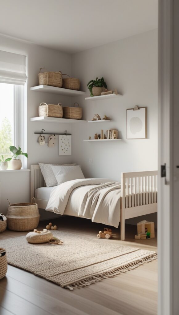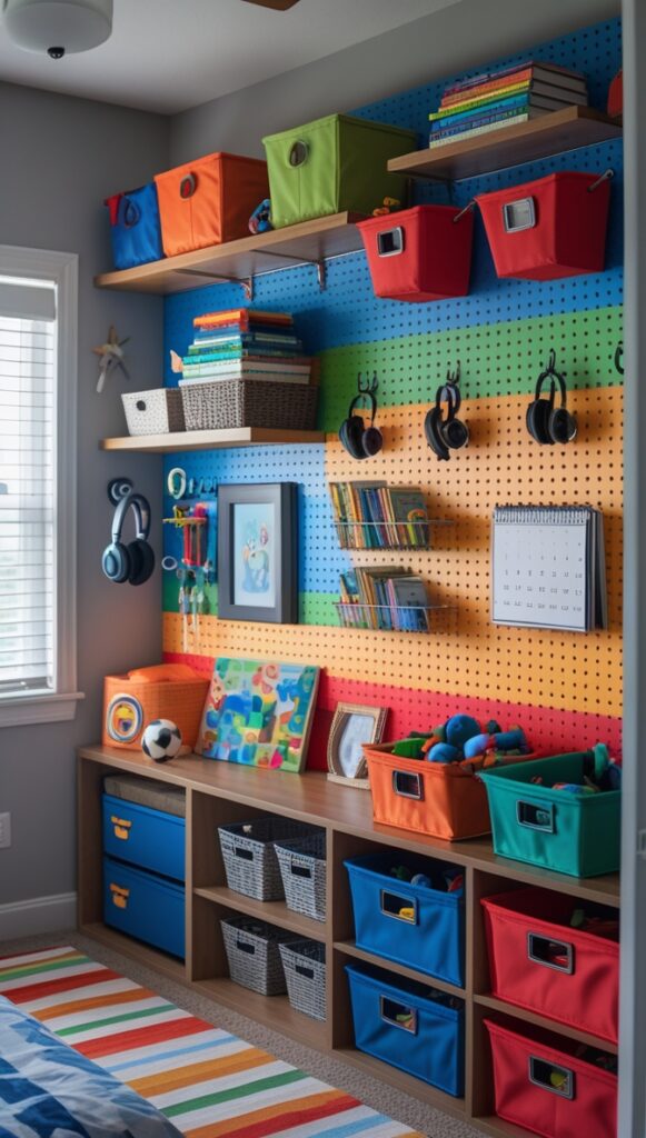 Tired of toys, books, and school supplies scattered everywhere? A pegboard wall is a genius solution. It’s fully customizable, meaning you can rearrange hooks, shelves, and baskets as your child’s needs change. Use it to hang toy bins, display favorite books, or store art supplies within easy reach. As they grow, swap out toy storage for headphone hooks, a calendar, or sports gear. This setup keeps the room organized, functional, and clutter-free without taking up extra space.