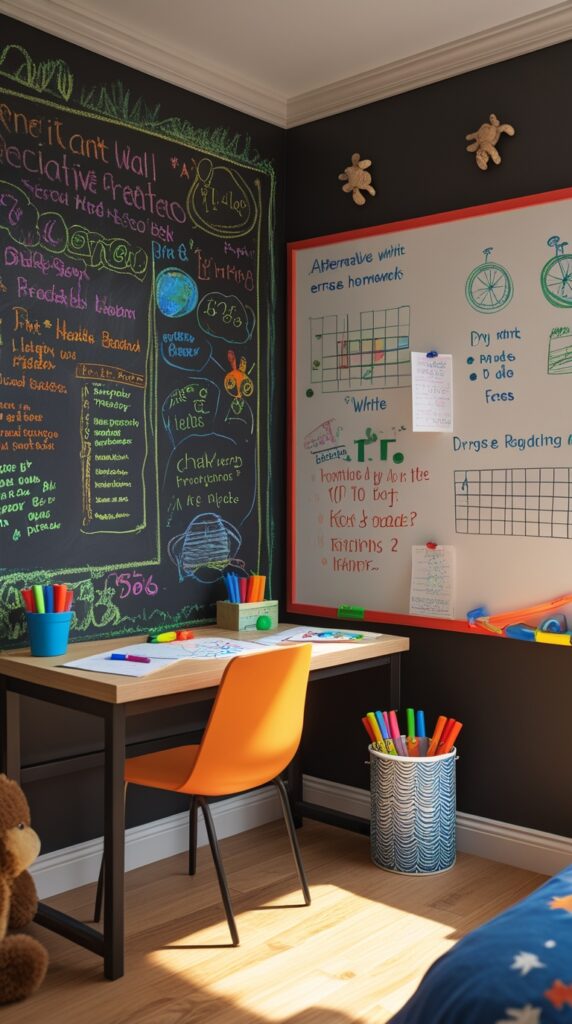 Kids love to draw, but walls often become their canvas. Instead of scrubbing off marker stains, create a dedicated chalkboard or whiteboard wall where they can doodle freely. A chalkboard-painted section near the desk is great for homework notes and to-do lists, while a removable whiteboard panel works well for changing interests. Whether it’s sketching superheroes or solving math problems, this space grows with them, keeping creativity alive without the mess.
