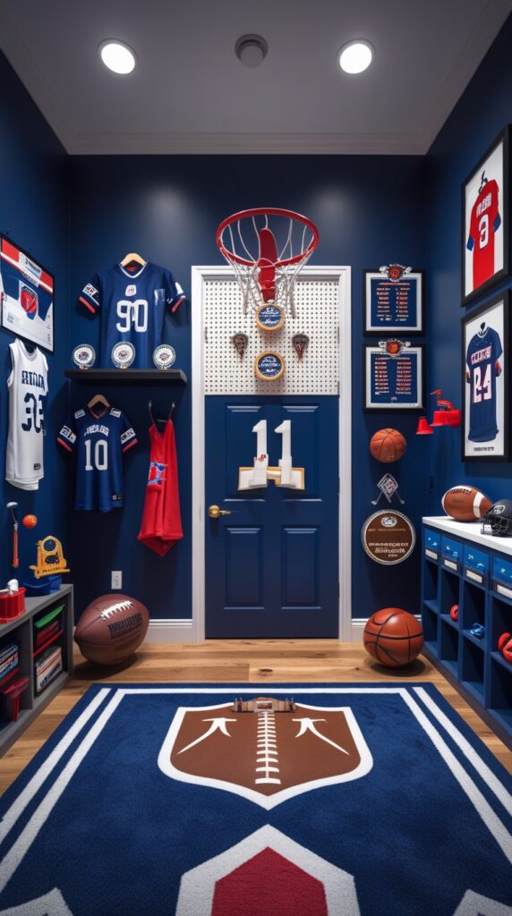 If your kid eats, sleeps, and breathes sports, this room will be their dream come true. Start with their favorite team’s colors for walls or bedding. Add framed jerseys or a pegboard to display medals. For an interactive touch, install a mini basketball hoop on the door or create a climbing wall for active play. Need more storage? Mini lockers keep gear organized while adding a stadium-like feel. These simple upgrades make the room feel like a personal sports arena—perfect for kids who are always on the move.