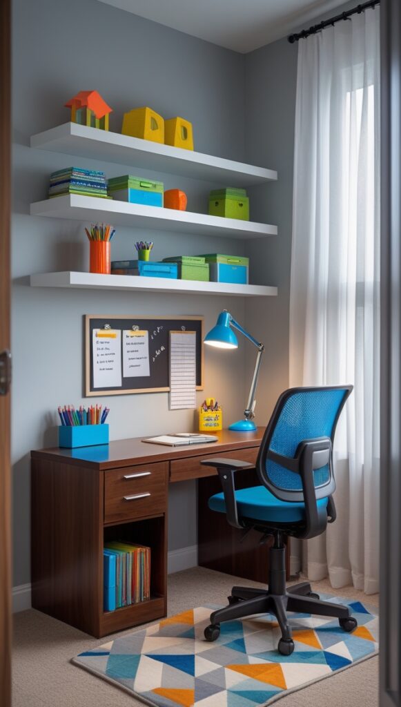 Homework time can be a struggle, but a dedicated study space makes it easier. A small desk with floating shelves keeps essentials organized while saving space. Add a pinboard for reminders and task lighting for better focus. For younger kids, a colorful workspace sparks creativity, while older students might prefer a sleek, minimalist setup. This setup helps create a distraction-free zone, boosting productivity without taking over the room.