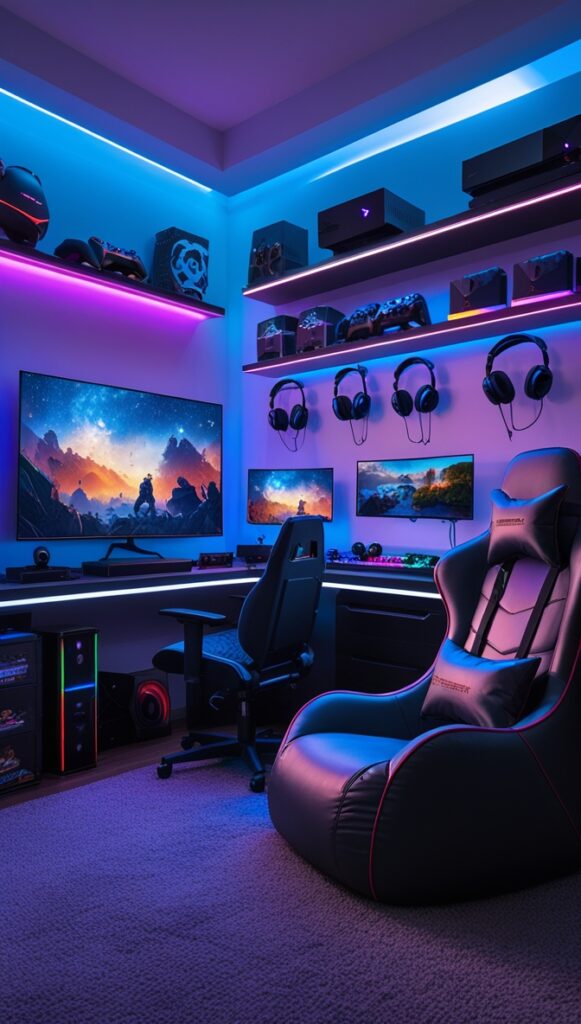 For kids who love gaming, a dedicated gaming zone keeps everything organized and stylish. Start with LED backlighting behind the desk or TV for an immersive vibe. A comfortable gaming chair or bean bag ensures long sessions stay cozy. Wall-mounted shelves or pegboards neatly store controllers, headsets, and game cases, preventing clutter. With the right setup, this space becomes a dream spot for both fun and focus—without turning into a chaotic mess.