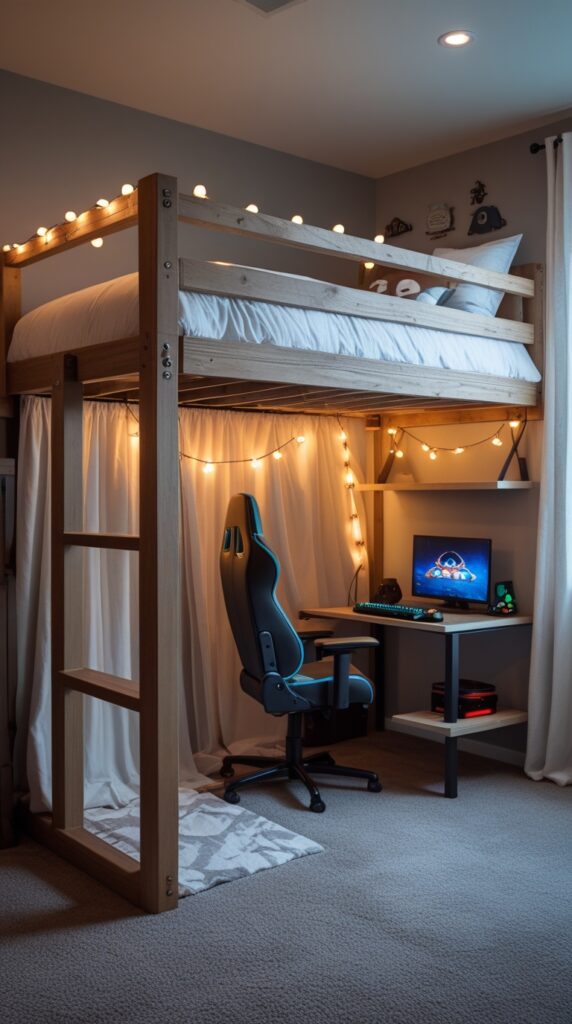When space is tight, a loft bed is a game-changer. By raising the bed, you free up valuable room underneath for a play area, study space, or gaming setup. Imagine a mini fort with string lights and curtains—a secret hideout kids will love. For older boys, a small desk with shelves creates the perfect study nook. Gamer? Set up a cozy chair and LED-lit gaming zone. This layout keeps clutter off the floor while making the room feel bigger and more functional.