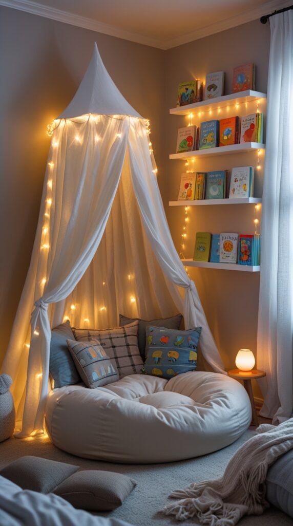 If your child prefers storybooks over screen time, a cozy reading nook is a must. A canopy tent with fairy lights turns a small corner into a magical hideaway. Floating bookshelves make it easy to grab a book while doubling as decor. Add plush cushions or a bean bag, and you’ve got a spot so inviting, that even reluctant readers might curl up with a book. This setup is perfect for winding down at night and helps create a love for reading—without forcing it.