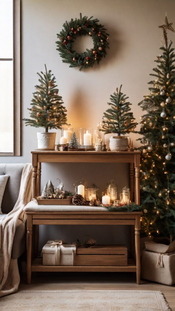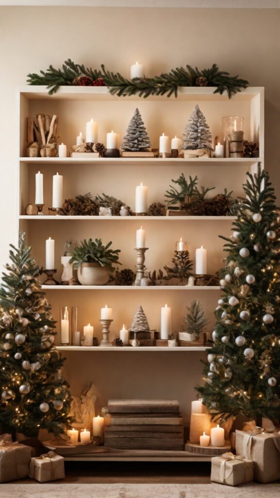 Shelves can be an easy way to add festive touches without overcrowding your space. Style them with a mix of mini Christmas trees, candles, and small garlands for a balanced and cozy look. Keep some open space between items so the decor feels intentional, not cluttered.