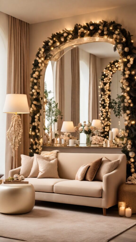 A simple way to make your living room feel brighter and more festive is by wrapping a garland with fairy lights around a mirror. The reflection doubles the glow and spreads soft light throughout the room. It’s a small detail that makes the whole space feel warm and inviting.