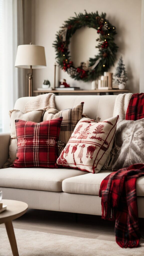 Switching out your regular pillow covers is an easy way to bring in holiday charm. Go for covers with plaid, reindeer, or snowflake patterns to instantly make your living room feel festive. It’s a quick update that makes a big visual impact without taking much effort.