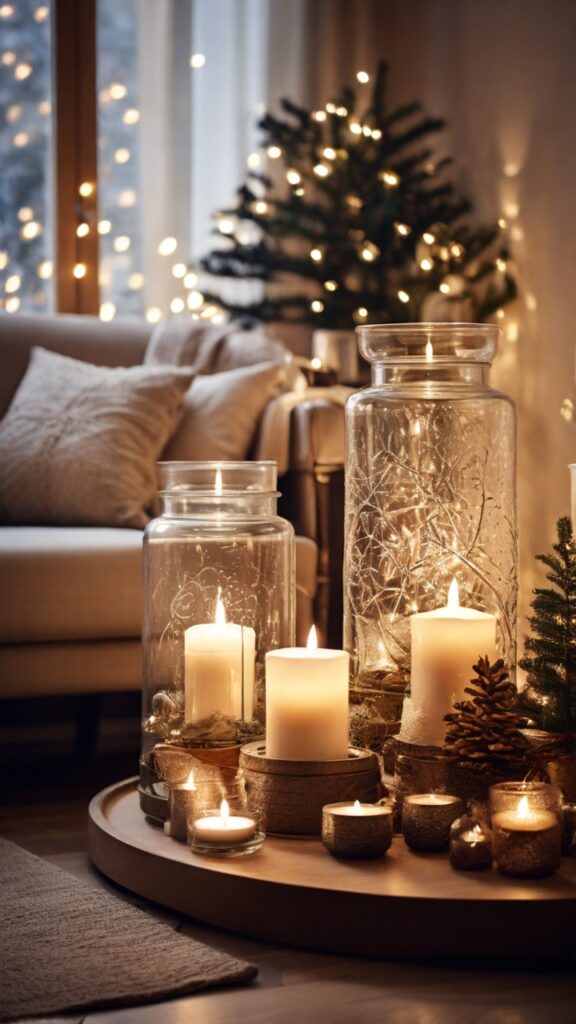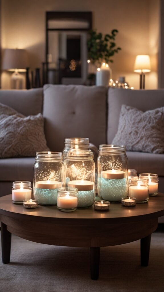 Mason jars make perfect candle holders for a cozy glow. Fill them with some Epsom salt to create a frosted snow effect, then place tealights inside. They look beautiful on shelves, coffee tables, or window sills, and are an easy, budget-friendly DIY that Pinterest readers love.