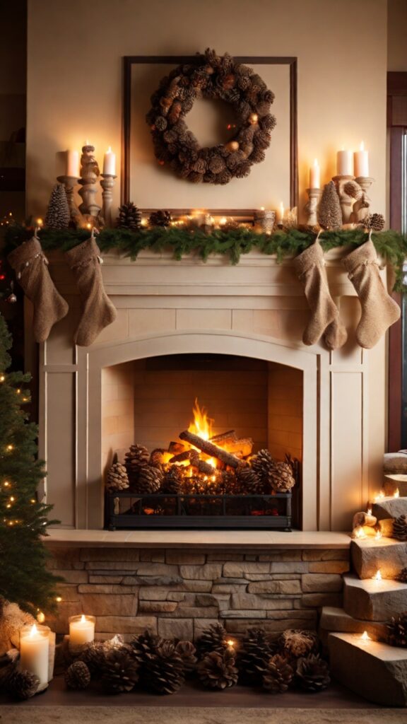 The fireplace is often the centerpiece of a living room during the holidays. Whether you have a real one or a faux version, decorate it with stockings, pinecones, and a few strands of fairy lights. This combination adds warmth and a festive glow that ties the whole space together.