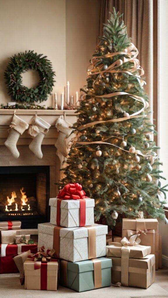 You can turn wrapped gift boxes into beautiful decor pieces. Stack them neatly near the tree or place a few under a console table to fill empty spaces. Use coordinating wrapping paper and ribbons to match your color theme and tie the whole look together.