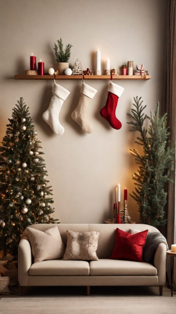 Stockings aren’t just for the fireplace. Try hanging a few across your console table, TV stand, or even along a wall shelf. Add names or initials to make each one feel personal and festive. It’s a simple DIY idea that adds character to your living room.
