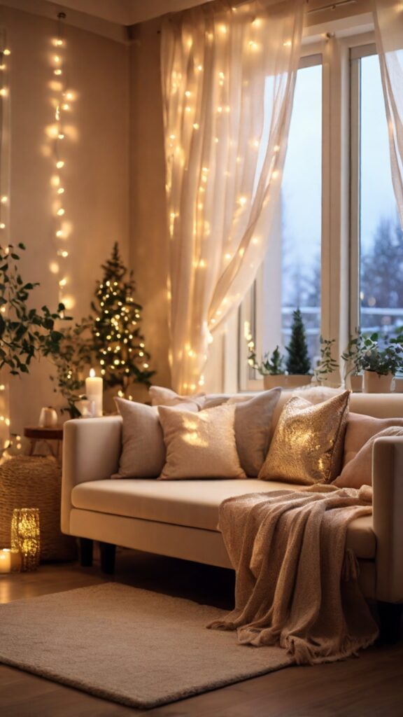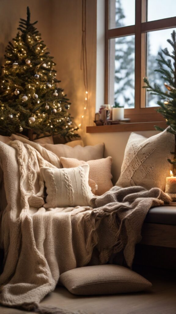 If you have an empty corner in your living room, turn it into a small cozy nook. Add a soft throw, a few pillows, and a mini Christmas tree to create a relaxing spot where you can read or unwind. A string of fairy lights or a small lamp will make it even more inviting.