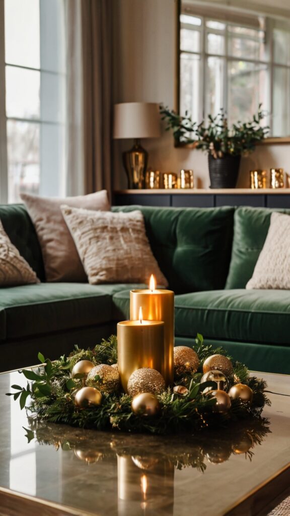 Your coffee table can easily become a small focal point with the right decor. Use a decorative tray to group candles, mini ornaments, and greenery together. Mixing gold accents with fresh or faux greens adds a touch of elegance while keeping the look cozy and balanced.