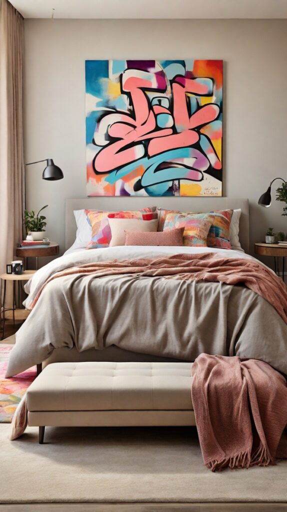 Whether you choose a bold abstract design or something with words and symbols, it gives your walls that creative, lived-in feel. This kind of art perfectly complements a city apartment aesthetic, turning plain walls into something that feels expressive and full of personality.