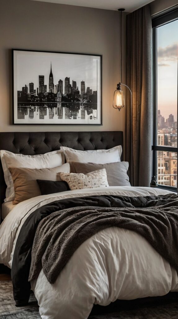 Mixing classic prints with modern lighting is an easy way to create urban-inspired bedroom decor that feels stylish and full of personality.